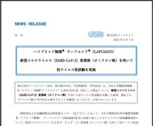 弊社取扱商品のハイブリッド触媒「ラーフエイド」が新型コロナウイルス(オミクロン株)を用いて抗ウイルス性試験を実施しました。