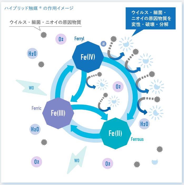 ハイブリッド触媒®は、鉄イオン触媒の強力な酸化力を利用して、細菌・ニオイの原因物質を破壊・分解する新しいタイプの抗菌・消臭機能材です。そのパワーを持続し強化するために鉄イオン触媒に常に酸化力を注入できるよう、鉄と相性の良い希元素を極微量配合しました。これにより、鉄イオン触媒の酸化還元反応がスムースに進行するため、広い範囲のニオイに対して安定的に消臭機能を発揮し、強い抗菌力を長期間持続します。